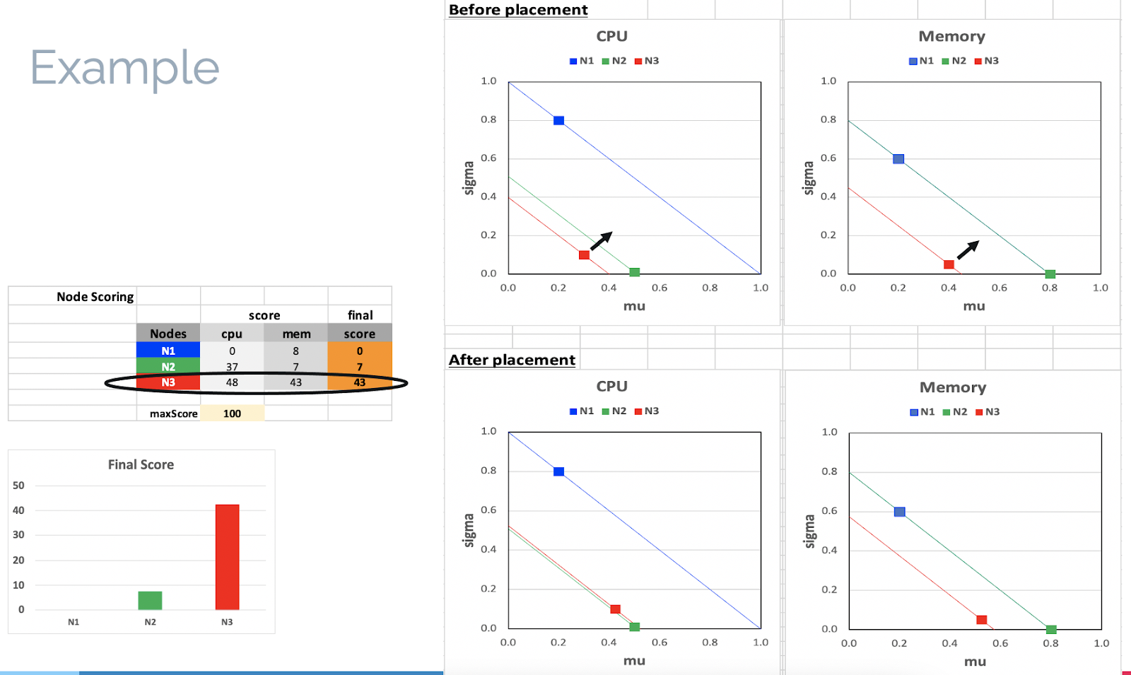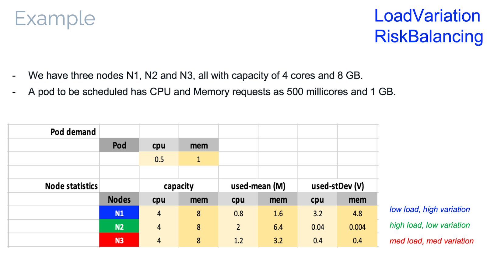 A load-aware scheduler that uses only average resource utilization figures may not be enough as variations in the utilization on a node also impact the performance of containers running on that node. The jitter in resource availability to containers over time affects the execution and behavior of the application comprising such containers. Hence, the load-aware scheduler should consider both the average utilization as well as the variation in utilization. A motivating example was mentioned above, where a load-aware scheduler that balances risk should favor the more-stable node for placement of a new pod.