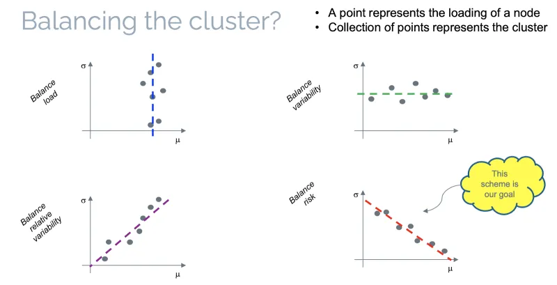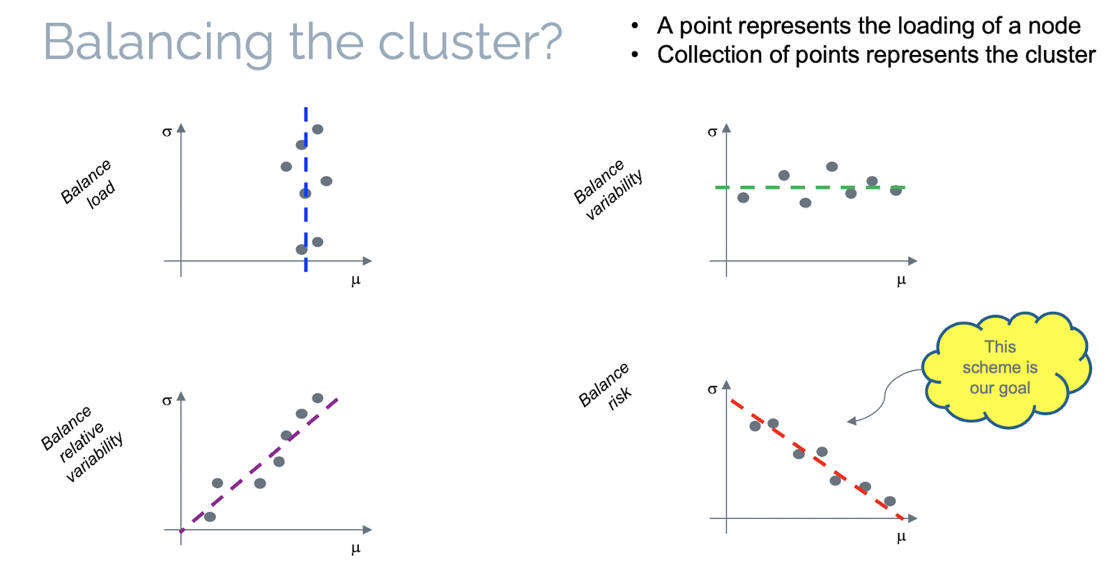- Balance relative variability: Equalize the coefficient of variation (defined as the ratio of standard deviation over average utilization) among nodes.