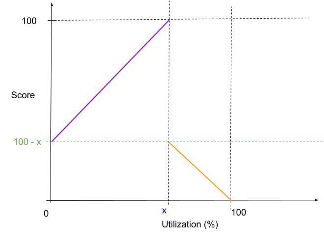TargetLoadPacking plug-in aims to score nodes according to their actual usage. Eventually, all nodes' utilization can be maintained at a level, x%. It works in two stages, as shown in the figure below. When most nodes in the cluster are idle, the scoring function will favor nodes with the maximum utilization below x%. When all nodes have utilization around or above x%, the scoring function will favor nodes with the minimum utilization. Essentially, it packs workload on nodes until all nodes have around x% utilization and then spreads workload to balance the load on nodes.