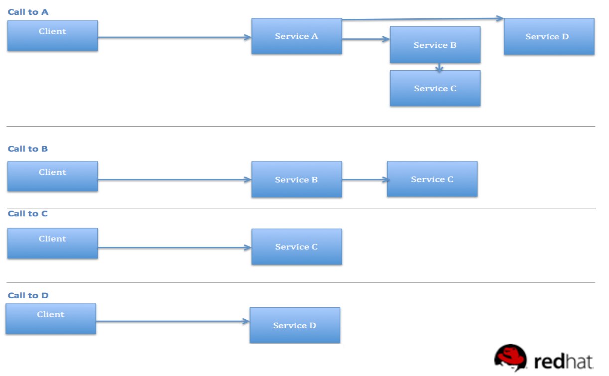As we can see, calls to A and B involve chained calls to C and D. Calls to C and D are self-contained. We’ve expanded the implementation by adding 25 endpoints to each microservice. There are therefore 100 endpoints in total.
