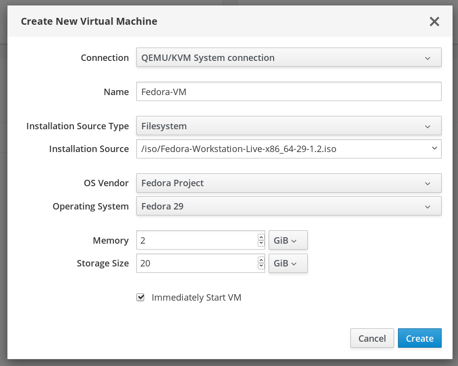 To create a new virtual machine, click on the Create VM button. In this example, we have downloaded a Fedora 29 ISO image to /iso/Fedora-Workstation-Live-x86_64-29-1.2.iso, and will create a new VM with it as an installation source, as shown: