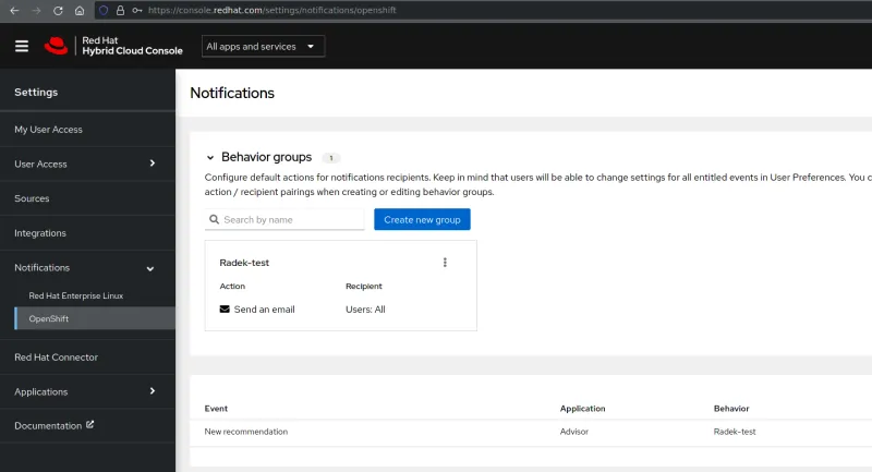 The notifications administrators can create a default action for each application, which the Hybrid Cloud Console calls a “behavior group.” They can create a new Behavior by selecting the Settings icon in the Hybrid Cloud Console, then Notifications, and then OpenShift. This allows them to specify whether email notifications will be sent or whether they can configure a webhook for a third-party tool, ticketing system, or instant messaging. The example below shows creation of a test group used to send emails when a new OpenShift Advisor Recommendation is found.