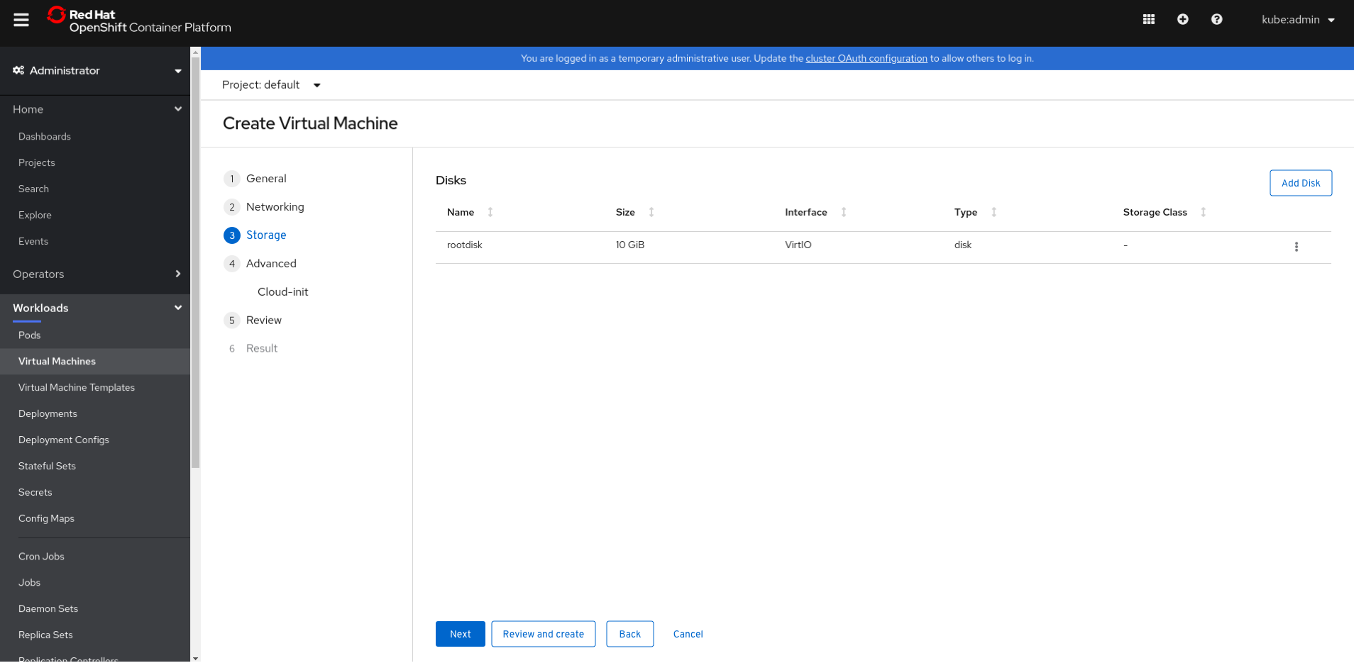 Select an existing Persistent Volume Claim as a disk that has been previously cloned or created. When selecting “Attach Disk” the user will be prompted to select an available disk that has been previously cloned or created and made available as a Persistent Volume Claim.
