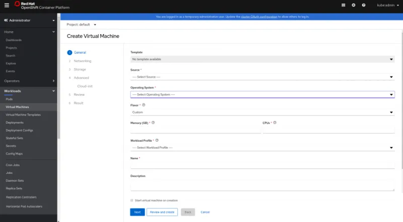 Selecting an operating system will fetch the relevant fields required, and available options for that OS. By doing this, the console will provide predefined resources request configurations called ‘workload profile’ and ‘Flavor’ suited for that OS which we will look into next.