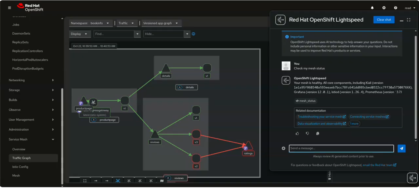 In addition to the native chatbot, Kiali has also integrated a variety of tools into the Kubernetes MCP server. This allows Kiali to be used via AI agents or your tool of choice, including with Red Hat OpenShift Lightspeed. Check out a demo of OpenShift Lightspeed being used with Kiali to troubleshoot workloads that are part of a service mesh.