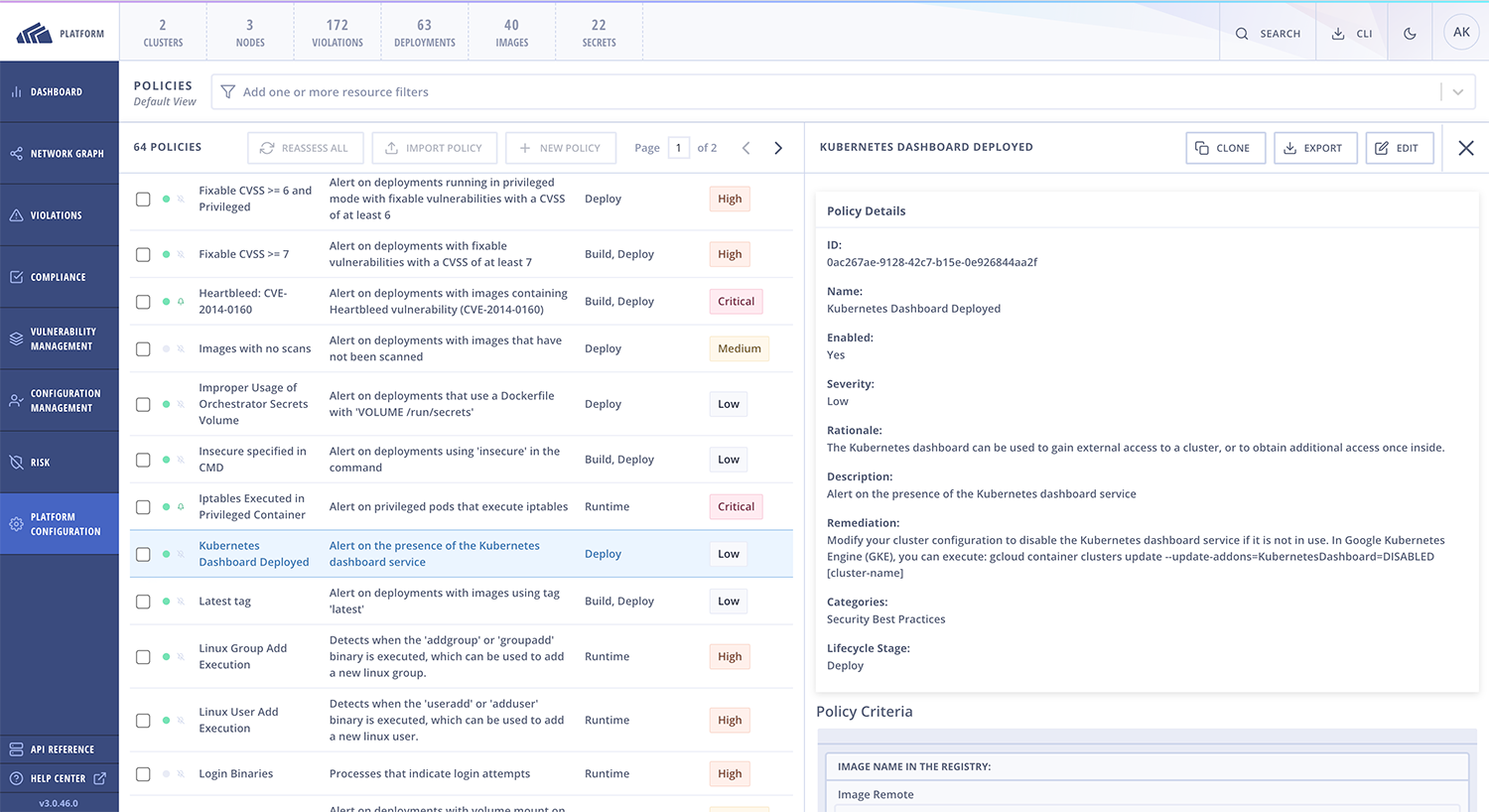 StackRox provides a built-in policy to alert when the Kubernetes Dashboard is deployed. It also monitors RBAC privileges on service accounts and can identify whether elevated privileges have been granted to the Dashboard. It can also ensure incoming traffic to the Dashboard is blocked by configuring Kubernetes Network Policies.