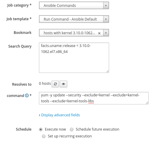 This time, we will use the Ansible Commands job category and the Run Command - Ansible Default job template. We will again select the previously created search bookmark named hosts with kernel 3.10.0-1062.el7.x86_64. For the command, we will specify kpatch list | fgrep 'kpatch_3_10_0_1062_1_2 [enabled]’ Note that the text used for the fgrep command (kpatch_3_10_0_1062_1_2 [enabled]) doesn’t match the name of the package (kpatch-patch-3_10_0-1062-1-2.el7.x86_64). The easiest way to find the text to use in the command is to login to one of the client servers that was patched and run kpatch list to see a list of enabled kpatchs.