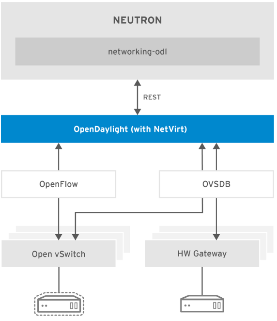 Starting with Red Hat OpenStack Platform 8, Red Hat is bundling a limited distribution of OpenDaylight that is co-engineered with Red Hat OpenStack, and offered as a Technology Preview. It combines carefully selected OpenDaylight components that designed to help you set up a lean and stable OpenDaylight solution as a networking backend for your Red Hat OpenStack Platform environment. The key OpenDaylight project used in the Red Hat solution is NetVirt. NetVirt is a Network Virtualization application developed on OpenDaylight consisting of modular sub-services such as L2, L3, ACL, NAT, DHCP, IPv6 control, and more. It currently supports the OpenStack Neutron API and controls Open vSwitch (OVS) instances by leveraging OpenFlow and OVSDB.