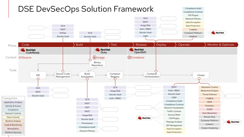However, understanding where each partner fits into DSE’s DevSecOps solution isn’t a straightforward task. The good news is that Red Hat has worked with Tureaud to lay out a DevSecOps solution starting from a framework consisting of nine security categories and 32 security methods that are all mapped to integration points in a DevOps lifecycle. This allows DSE and Red Hat to have the appropriate conversations regarding where DSE may look to Red Hat’s ecosystem to extend and enhance Red Hat functionality. For example, Red Hat has DSE covered with platform security and certain pieces of network controls, and Red Hat’s partners can enhance the solution in the areas of application analysis, identity and access, and runtime analysis.