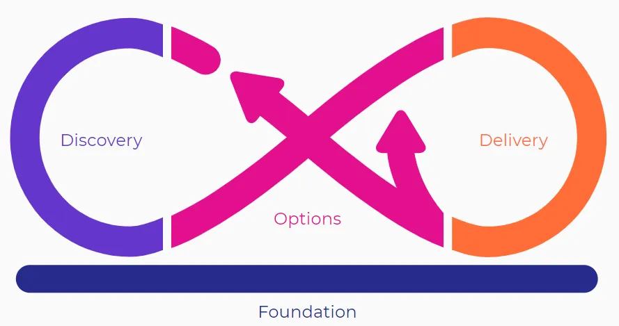 Used in the “discovery” segment of the loop, this concept is a great method of prioritizing user needs, broadens the potential for finding and experimenting with the best ideas, and can define target outcomes. Your team’s product manager will pick a desired outcome, which will let the team come together to discuss opportunities and problem statements.