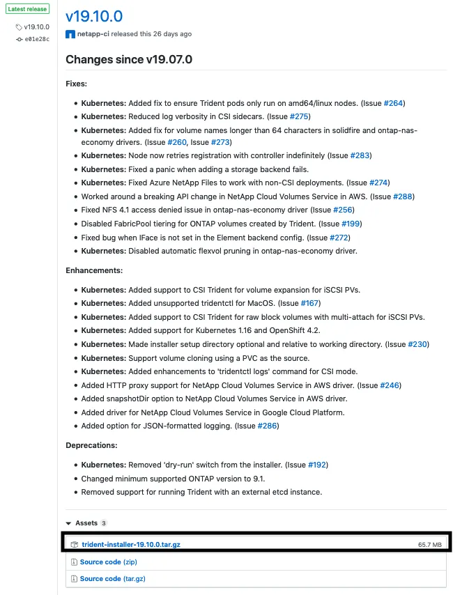 The installation procedure for Trident is straightforward, you can find the documentation here. Strat by retrieving the Trident installer from the GitHub site (https://github.com/NetApp/trident/releases). I am using the latest available version of Trident at this moment, which happens to be Trident 19.10.