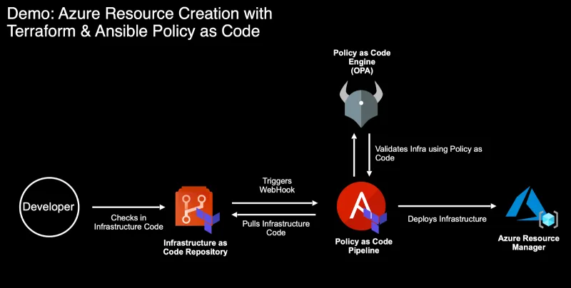 Also, all of the policies and code are maintained in Azure Repos. But again, any other common repository can be used. Finally OPA is lightweight enough that a developer can easily use it to validate a new policy on their laptop before checking it in as code.