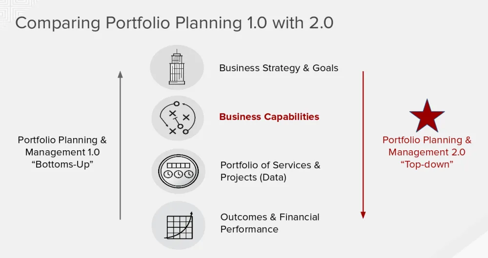 Strategy in portfolio planning prioritization 1.0 vs. 2.0 poses an interesting question. In Prioritization 1.0, is your organization really lead by strategy? Or is your strategy developed only in response to the projects that receive funding? Prioritization 2.0 provides a delivery approach that reflects long-term business interests defined by the organization’s strategy, and make recommendations on what business capabilities (as featured in our blog series) are needed to drive current to future needs. Prioritization 2.0 takes the guesswork out of your investment and project decisions in order to support the long-term objectives of the organization. In other words, you can either choose to be a passive recipient of numerous individual investment decisions or an active director of where you want your organization to go.