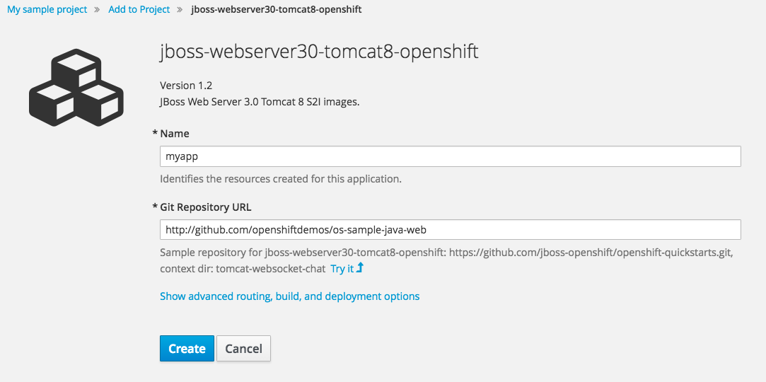 jboss-webserver30-tomcat8-openshift:1.2 and fill in the form like this: