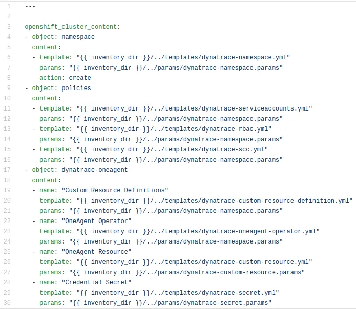 The following sample inventory was taken from the monitoring repository and shows how the deployment is logically broken into 3 sections with 8 templates. This can be used as-is to perform the deployment, but it also allows for a modular replacement of any of these templates to better fit with the target environment. Each template is paired up with a set of parameters stored in params files that allows for minor customizations of the deployment without having to replace the template - such as deploying to a different namespace, etc. There are 2 parameter files that have to be updated before the deployment is done, and those are the files containing the environment specific values, such as the Dynatrace (SaaS) URL, API Token and PaaS Token. Once this is done, the setup can be done with just a few commands seen below.