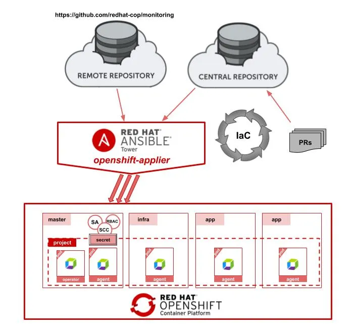 Monitoring of application environments is very important, and there are many kinds of monitoring to consider – infrastructure capacity and availability, as well as application responsiveness and availability to name a few. This is also true in a Platform-as-a-Service (PaaS) environment, such as one running the Red Hat OpenShift Container Platform. The use of containers mean that applications can be built as an immutable image that is deployed and promoted to multiple hosting environments at a rapid pace. This makes monitoring more complex, and the need for dynamic adaptation to the running environment is key to success. But what is the best way to deploy and manage the monitoring solution itself, which in many cases is also running fully or partially within containers? This is where Infrastructure-as-Code (IaC) comes in a useful approach. First, let’s define IaC.