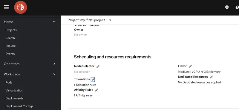 - Improved resource configuration: Configure the scheduling properties of virtual machines by accessing the scheduling and resources requirements section of the Virtual Machine Details page. View and manage affinity rules, dedicated resources, and tolerations for tainted nodes, and search for nodes with labels that match specific key/value pairs by using the Node Selector.