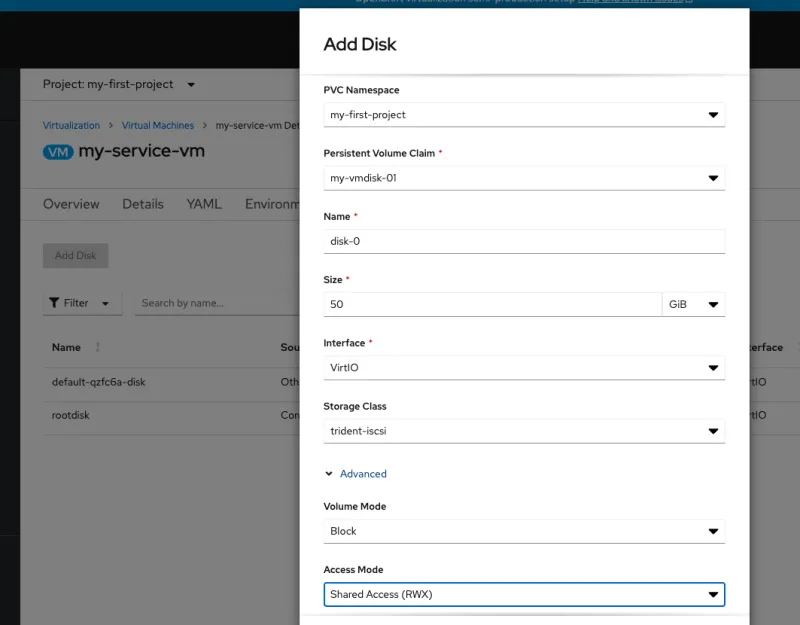- Advanced virtual disk configuration: Configure the Volume Mode and Access Mode for a virtual disk when you add a disk to a virtual machine in the web console. This is also possible when adding a disk to a new virtual machine using the wizard.