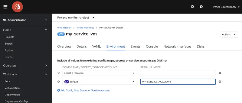 - Configuring the Virtual Machine environment: Add or remove secrets, ConfigMaps, and service accounts to a virtual machine on the Virtual Machine Overview → Environment page.