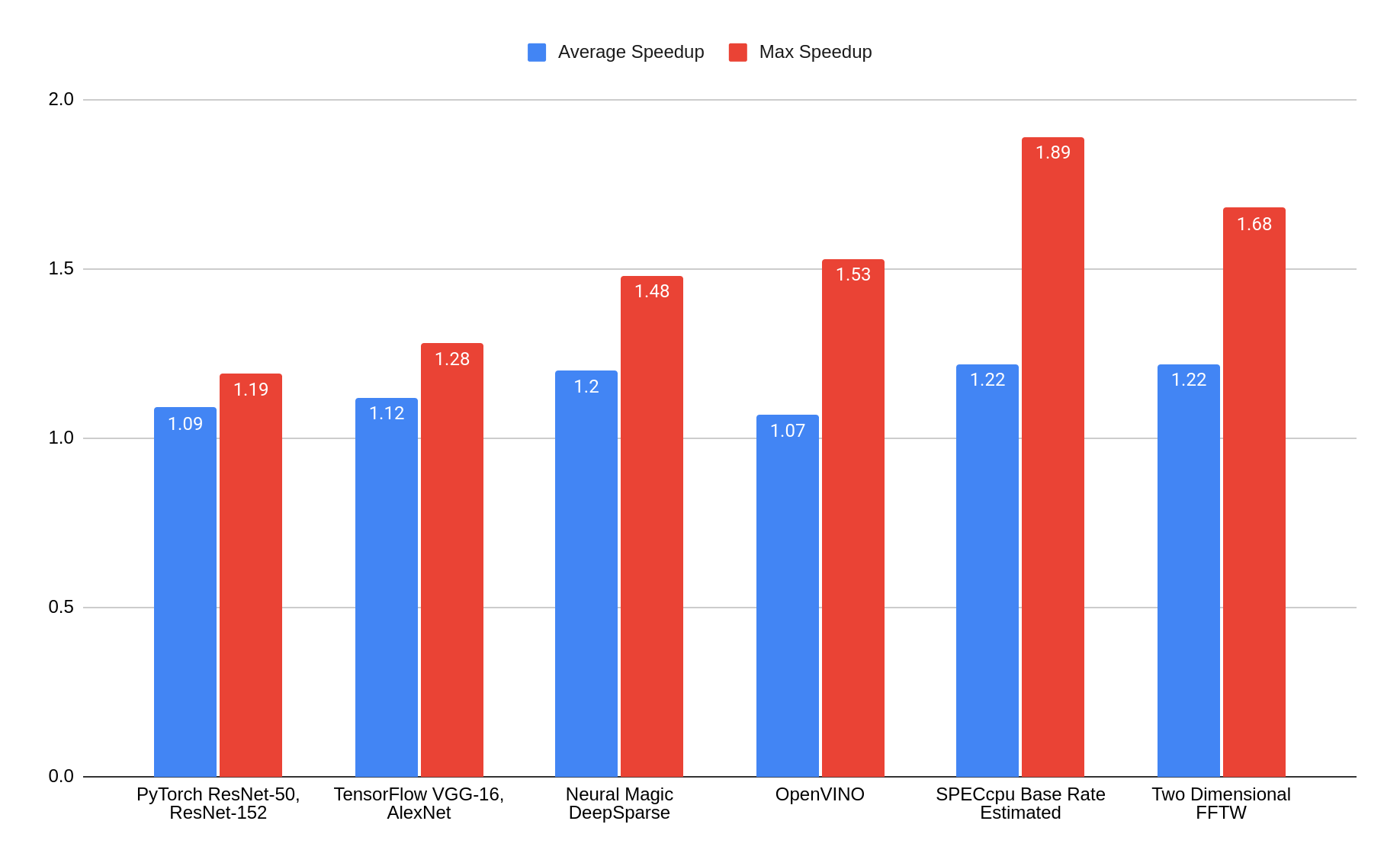 Abbiamo anche eseguito benchmark di elaborazione CPU generici come SPEC CPU Base Rate (stimata) e alcuni FFTW bidimensionali nei nostri sistemi di laboratorio per un confronto più congruo sui sistemi beta RHEL 9.4.