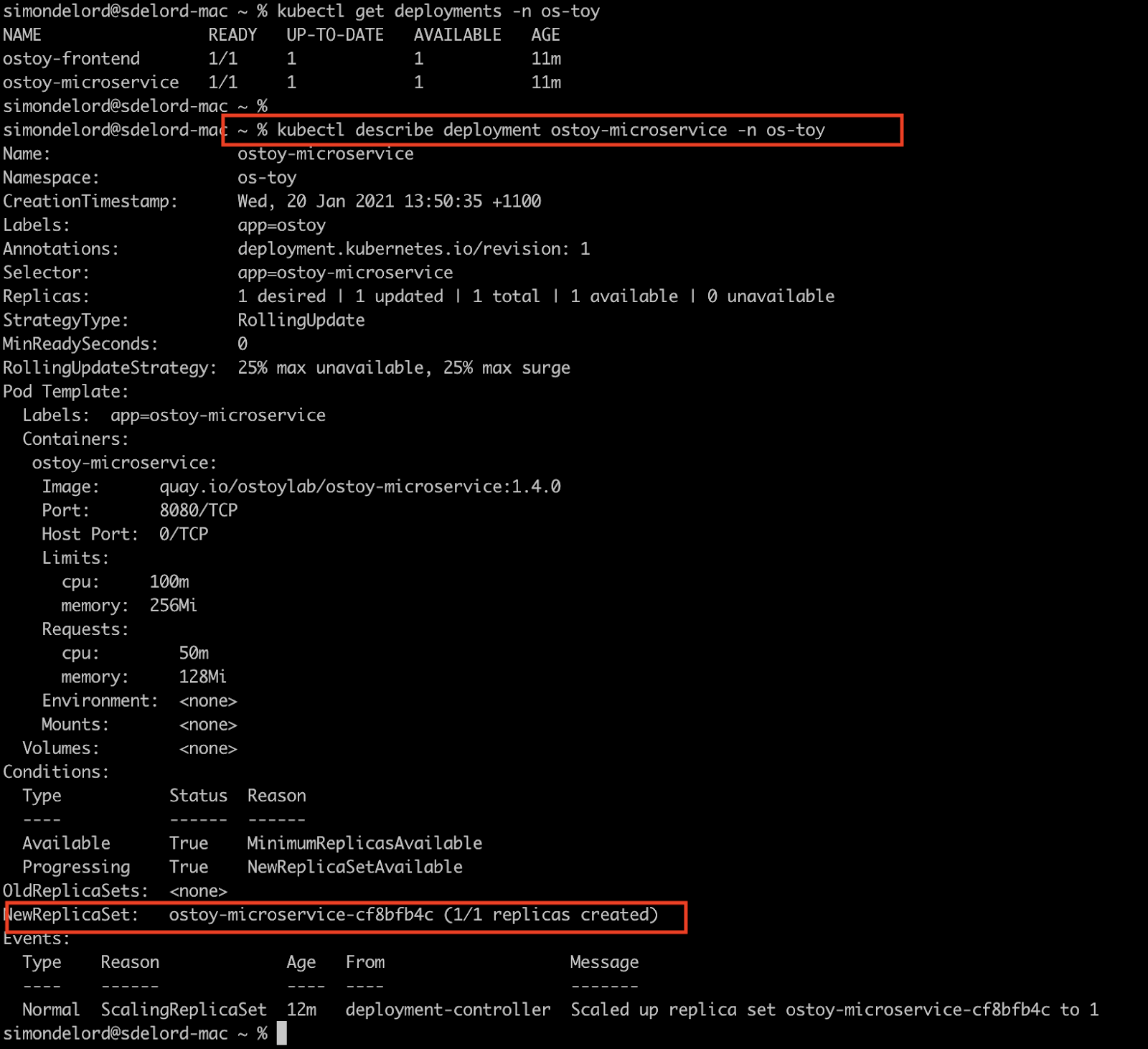 One part of the tutorial asks the student to use a Deployment to create an application. The following is an extract of the os-toy deployment YAML file: