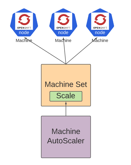 Those Machine Sets are used to scale the number of machines up or down (similar to what Replica Sets are to PoDs). This operation of increasing or decreasing the number of machines can be done manually, but again, for automation Machine Autoscalers (which define a number of min-max machines within a Machine Set) are used.