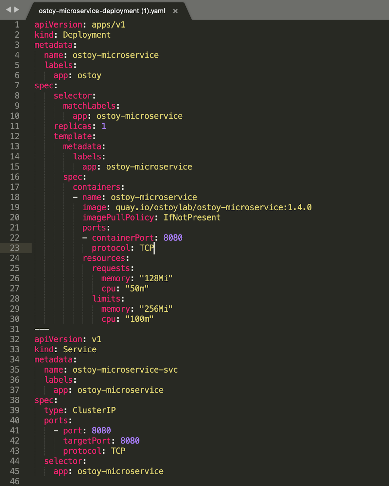 As you can see from the YAML file, the Deployment contains all the information required to describe the application, for example, how many PoDs to run (line 11), what container image to use (lines 17-30), the ports associated for the containers (lines 22-23), and the resources associated with the containers (lines 24-30).