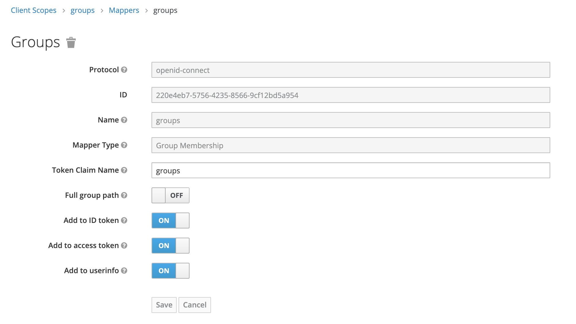 Once you've created the client scope you can now add a Token Mapper which will add the groups claim to the token when the client requests the groups scope. Make sure to set the Name as well as the Token Claim Name to groups, the Mapper Type as Group Membership and Full group path OFF.