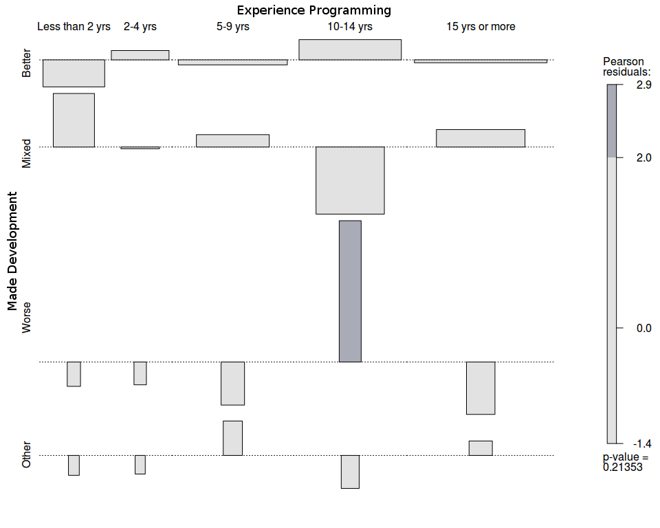 With this cross tabulation there is very weak evidence that developers with 10-14 years experience find the experience "Worse" more than expected (NOTE: there are still more developers in this age group who find it "Better" overall).