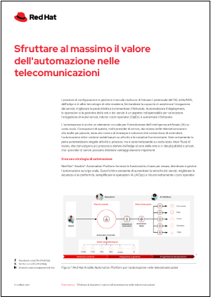 Semplifica le operazioni nell'ambito delle telecomunicazioni con Red Hat Ansible Automation Platform. Scarica la panoramica e scopri la prova gratuita per iniziare a utilizzare la piattaforma oggi stesso.