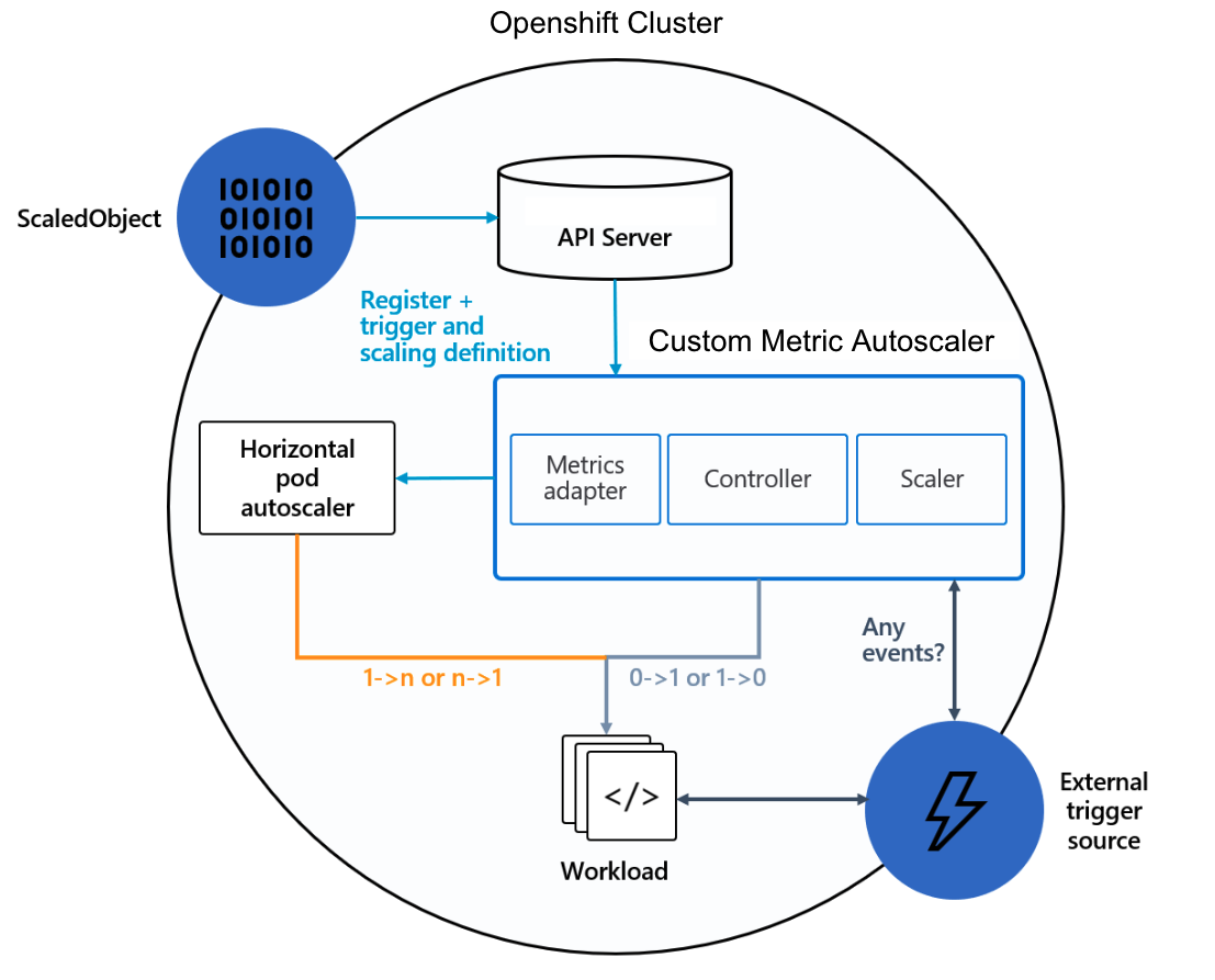 - Metrics Server - acts as an adapter to OpenShift API server and provides external metrics to Horizontal Pod Autoscaler Controller which drives autoscaling under the hood.