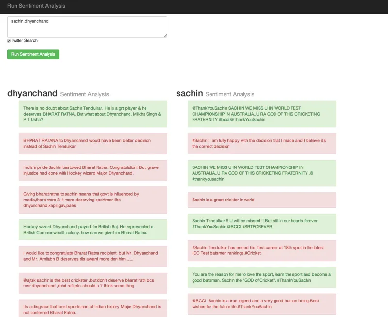 - The first functionality is that if you give it a list of twitter search terms it will show you sentiments in latest 20 tweets for the given search term. You have to enable this by checking the checkbox as shown below. The positive tweets are shown in green and negative tweets in red.
