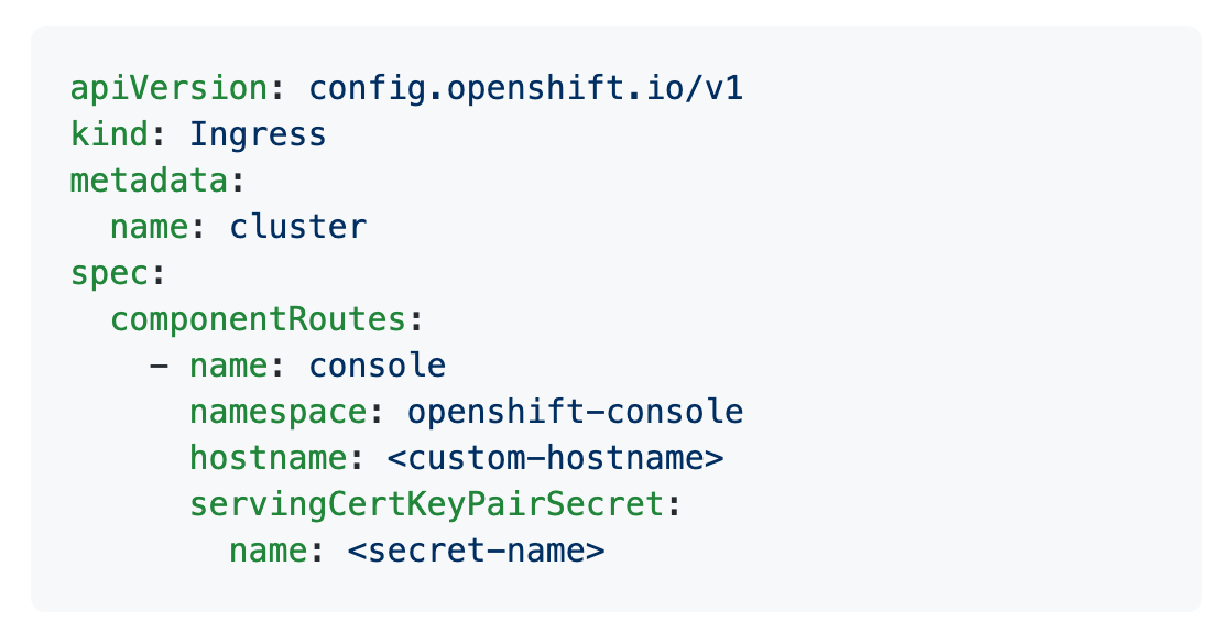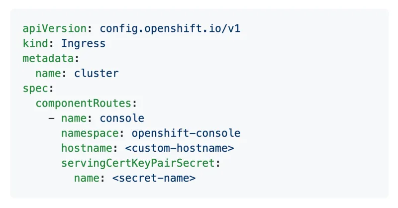 To customize the console route, log in to the cluster as a user with administrative privileges. Set the custom hostname and, if needed, set the TLS on the ingress config’s spec: