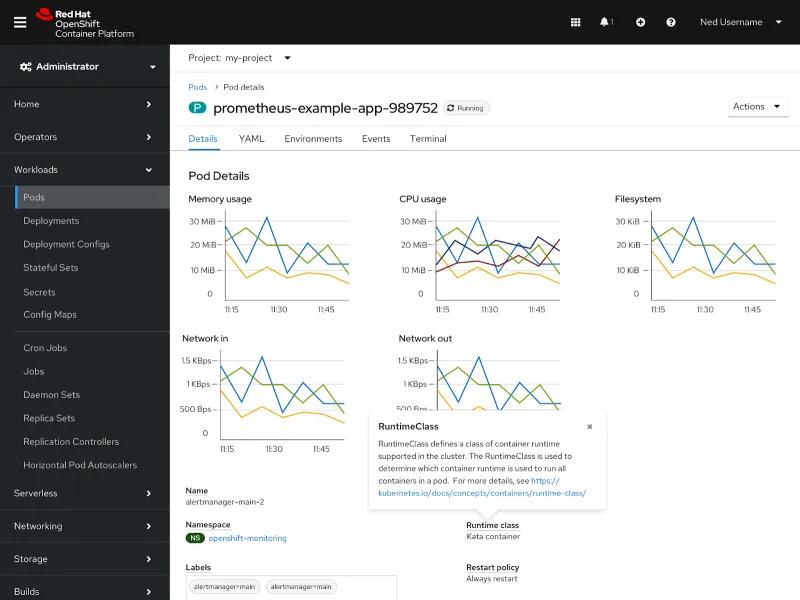 Surfacing the RuntimeClass field in the Pod details page will help users identify which deployments are using Kata container pods. The RuntimeClass heading should have a popover description that can be pulled from the schema.
