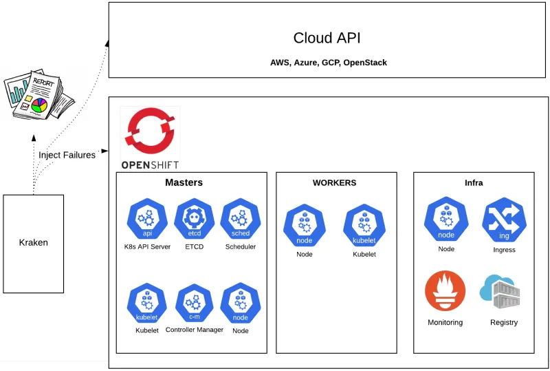 We developed a chaos tool named Kraken with the aim of “breaking things on purpose” and identifying future issues. Kraken enables the user to effortlessly inject chaos in a Kubernetes/OpenShift cluster. The user can continuously cause chaos and watch how the cluster responds to various failure injections over a long run. Additionally, one can validate if the cluster completely recovers from chaos and returns to its normal healthy state after a single set of failure injections.
