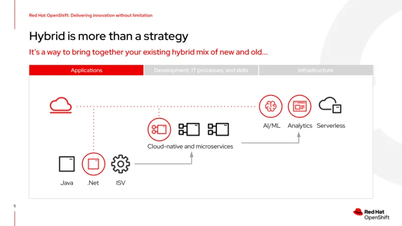 Open hybrid cloud is Red Hat's recommended strategy for architecting, developing, and operating a hybrid mix of applications, delivering a truly flexible cloud experience with the speed, stability, and scale required for digital business transformation. Hybrid done right is not just for new projects or for your future requirements. It should allow you to meet your current challenges and opportunities head-on, while positioning you for the future.