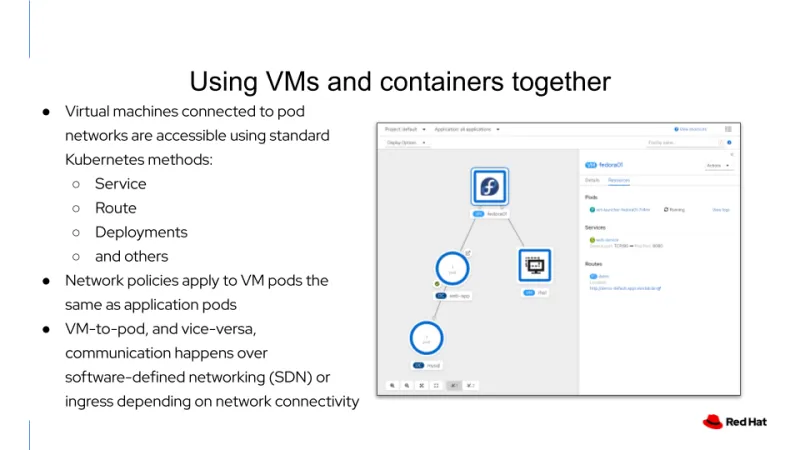 Incorporating KubeVirt into OpenShift as OpenShift Virtualization provides Red Hat a unique opportunity to present to customers a single platform for applications that leverage either a subset of, or all of, virtual machines, containers, and serverless together. Virtual machines can leverage OpenShift features like Service Mesh, GitOps, Pipelines, and Software Defined Networking.