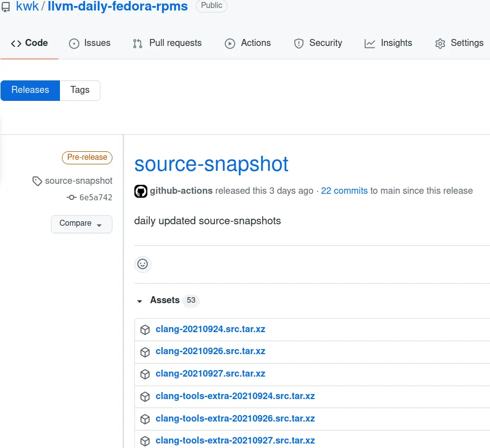 The pre-release entitled “source-snapshot” keeps the latest seven days of source snapshots before it starts to clean things up. I’ve made this a pre-release because this allows us to update this release without showing it up on the frontpage of the GitHub project. There, you’ll only see the latest regular release, but no pre-releases. This lets us constantly update the “source-snapshot” release and still “fly under the radar."