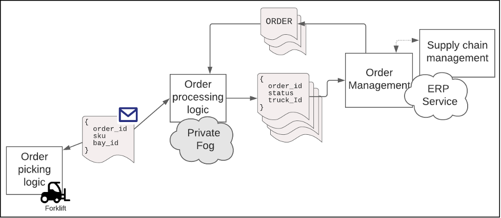 The smart forklift doesn't need to know everything about a customer order in terms of sending and receiving order information. All it really needs to know is the order ID, the merchandise ID (the SKU), and the warehouse bay where the pallet of merchandise is stored. These three values can be structured into a very small message received from the warehouse Fog. Such message exchanges can be facilitated via a typical HTTP request-response against a RESTful API. For faster transmission, the order information between the smart forklift and private Fog can be exchanged via a bidirectional gRPC stream.