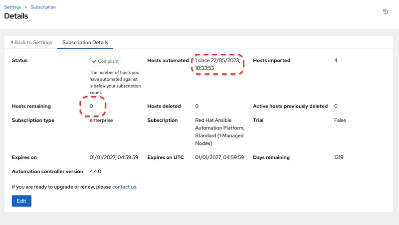 Hosts imported - this isn’t used for licensing counting purposes but is provided to show how many hosts you have “imported”. This term is a hangover from older tower releases but you can assume this means hosts that have been added or created in controller in some way. It can be useful to reference this number against your automated hosts count: