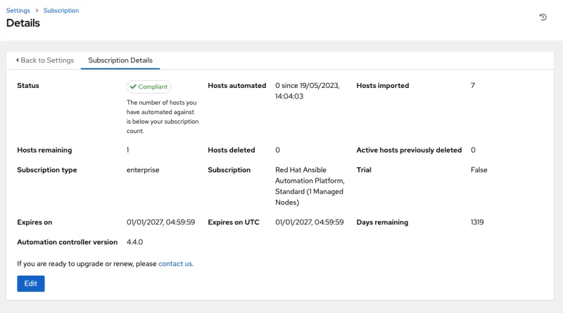 The subscription details now shows I’ve automated against 1 host but now have no hosts remaining, but I’m still compliant: