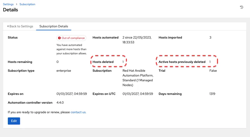 - Out of compliance i.e. you have automated against more hosts than your subscription allows