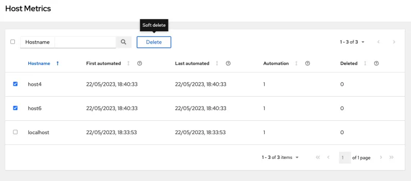 Let’s assume that those new hosts were ephemeral in nature (used only for CI purposes) and will never be used again. We can remove them from the Host Metrics view to account for this, by selecting the hosts and clicking on Delete: