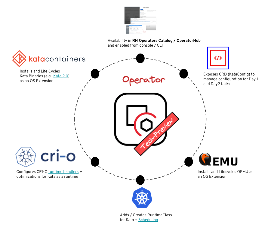 The OpenShift sandboxed containers Operator delivers and life-cycles all the required bits and pieces to make Kata Containers consumable as an optional runtime on the cluster. That includes but is not limited to: