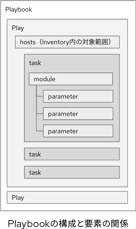 Ansibleにおける、処理(ステップ)の最小単位です。実行対象に対してあってほしい状態や実施する処理を記述します。