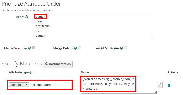 For advanced use cases, it is possible to merge multiple overrides. Going back to our motd example, we could specify a matcher at the domain level that contains the generic part of the login banner for all hosts in the domain. We could add additional matchers for each of the lifecycle environments present in Satellite. We could also add additional matches for individual hosts to provide host-specific information in the motd file. If we merge these overrides, they will all be combined to create a custom login banner for the hosts based on the criteria we defined in the overrides.