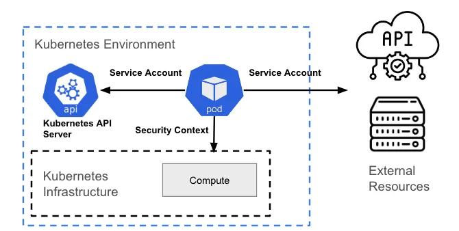 쿠버네티스가 아닌 API 호출의 경우 컨테이너는 외부 API 서비스에 인증할 때 포드 서비스 계정을 사용할 수도 있습니다.