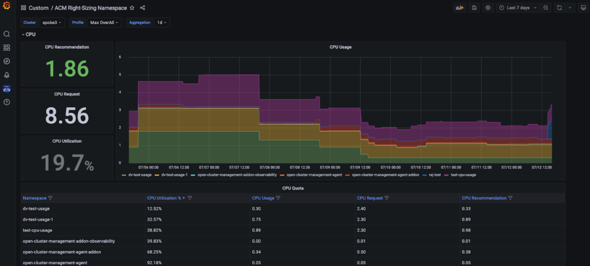 용량 관리 이점: RHACM Right Sizing 기능을 통해 플랫폼 엔지니어는 Red Hat Advanced Cluster Management for Kubernetes 콘솔의 일부인 전용 Grafana 대시보드에 표시되는 CPU 및 메모리 기반의 올바른 크기 조정 권장 사항에 액세스할 수 있습니다. 따라서 활용률은 시간이 지남에 따라 달라지므로 사용자는 더 긴 기간을 포함하여 다양한 집계 기간을 기반으로 하여 주요 권장 사항에 액세스할 수 있습니다. 따라서 이러한 권장 사항은 사용자 친화적이고 쉽게 사용할 수 있습니다(아래 그림 참조).