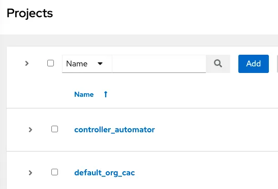 Create a controller_automator project and point it to the central controller automation playbook repo. Then create a project for the organization and point it at the inventory repo. Here, the organization we are using to demo is the Default org. We name the inventory’s project default_org_cac.
