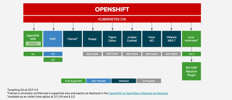 Currently, the default OpenShift CNI is OpenShift SDN (network-policy), which configures an overlay network using Open vSwitch (OVS 2.11). The following diagram shows the CNI options for OpenShift and the status of each (supported, validated, etc. …):